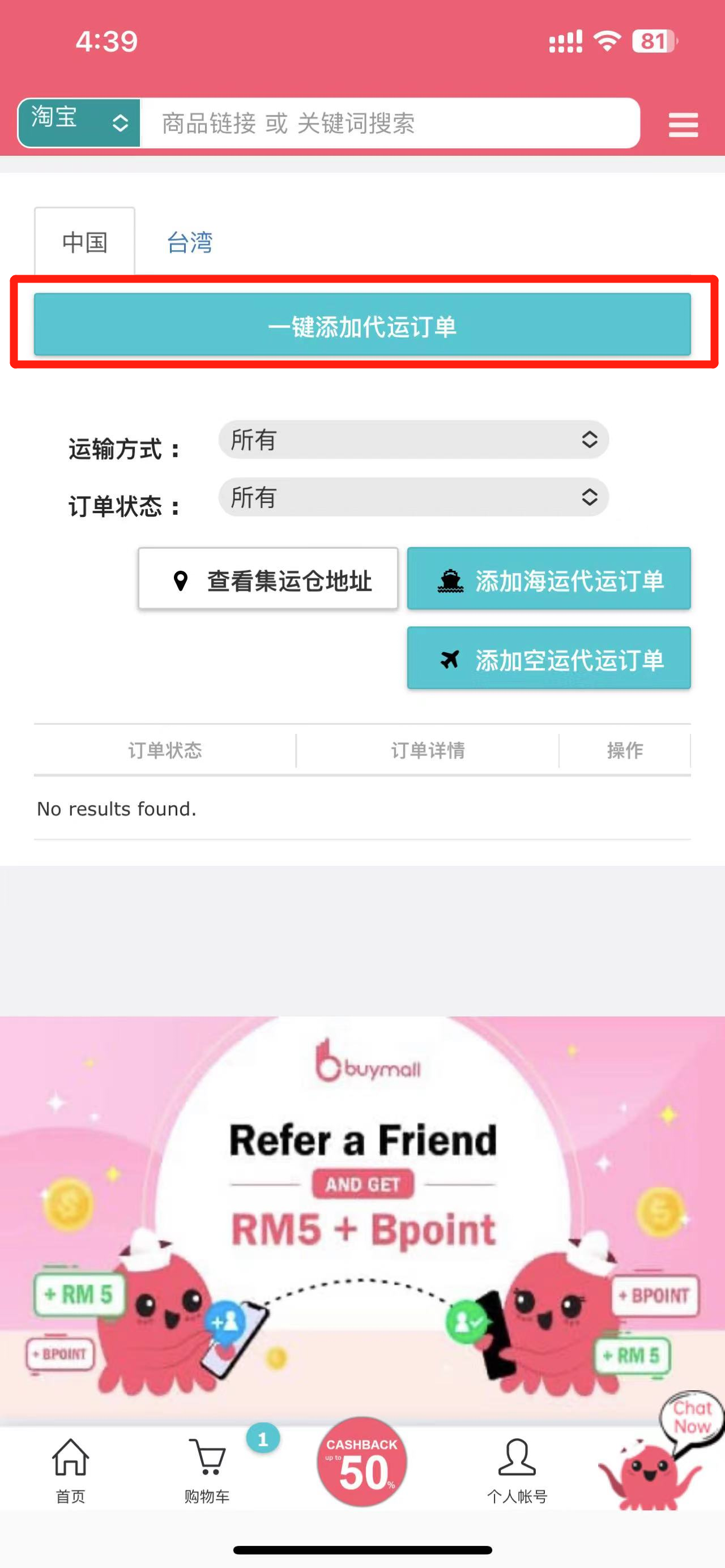 使用手机应用程式时,无需再手动复制淘宝订单的物流信息,然后将运单号输入到BuyMall如此繁琐,只需使用“淘宝一键添加代运订单”功能,即可快速将运单号添加到BuyMall,十分省事省心!