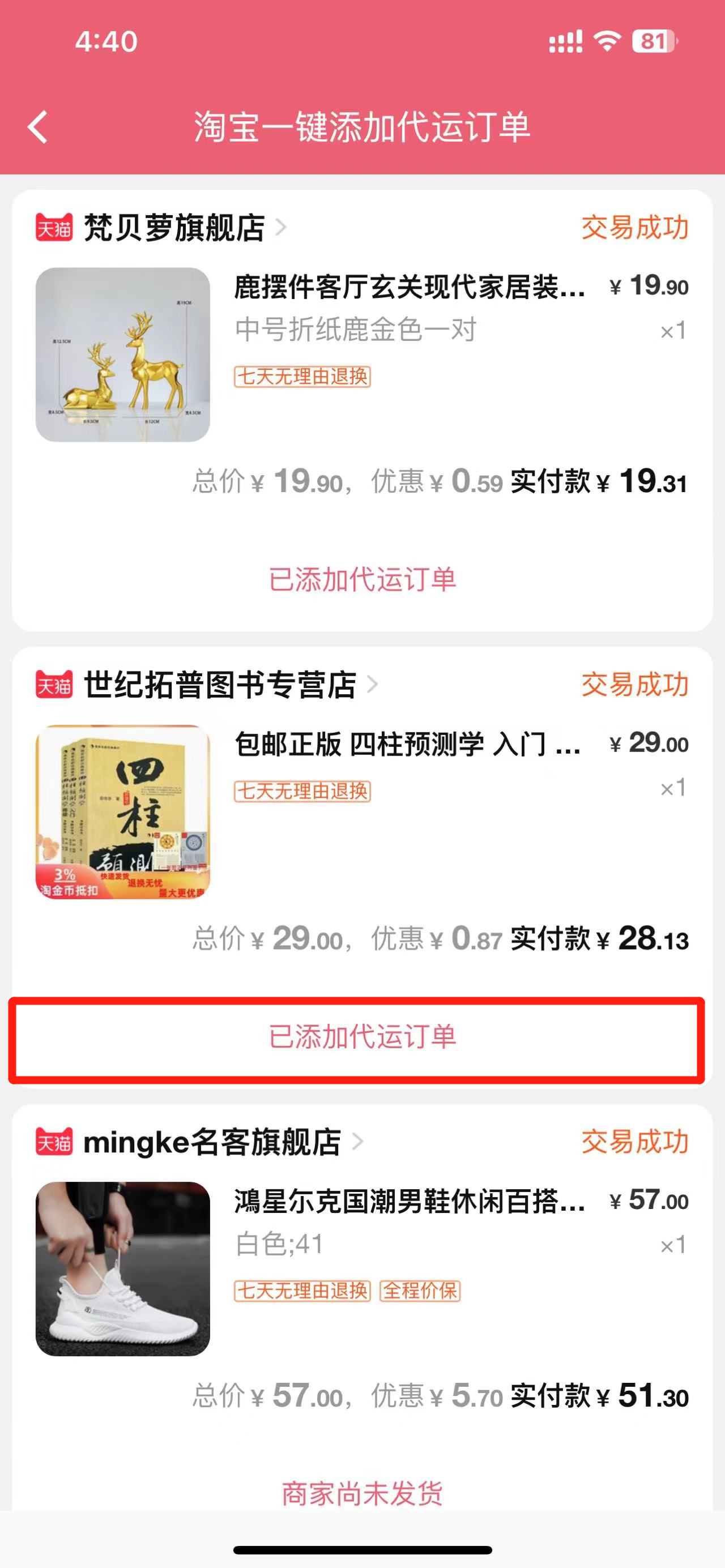 5. 显示“已添加代运订单”代表已成功添加此订单