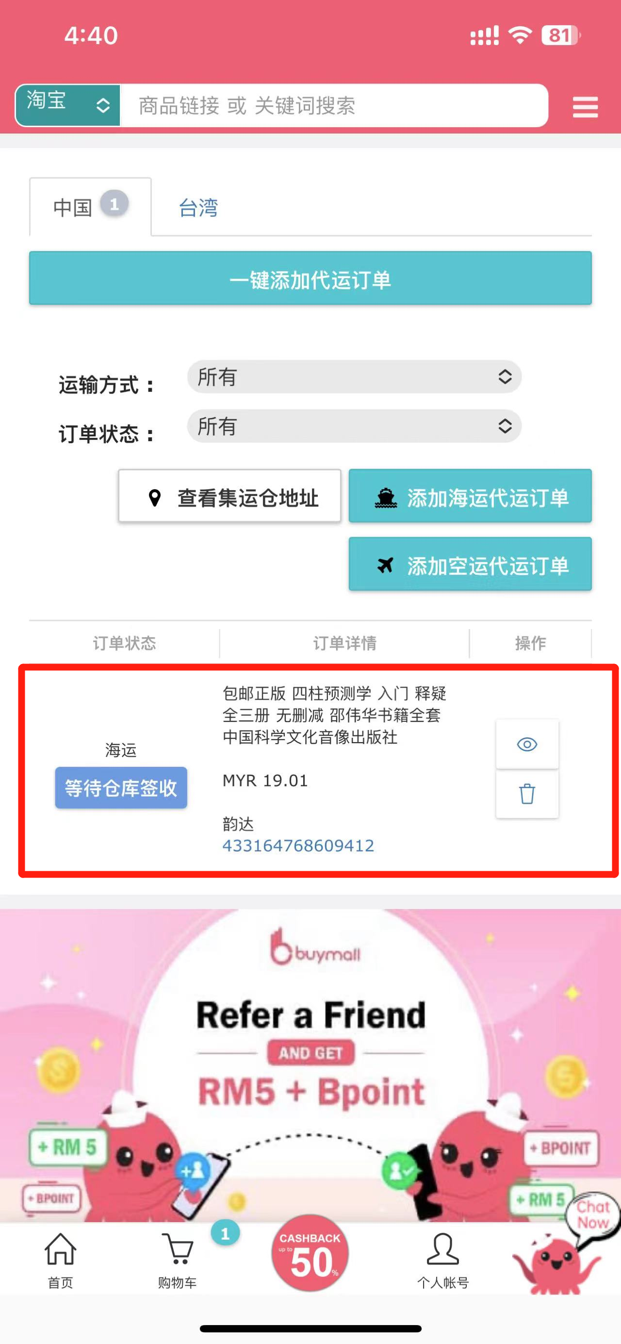 6. 返回到BuyMall代运订单页面,即可查看到已添加的代运订单等待仓库签收后进行集运